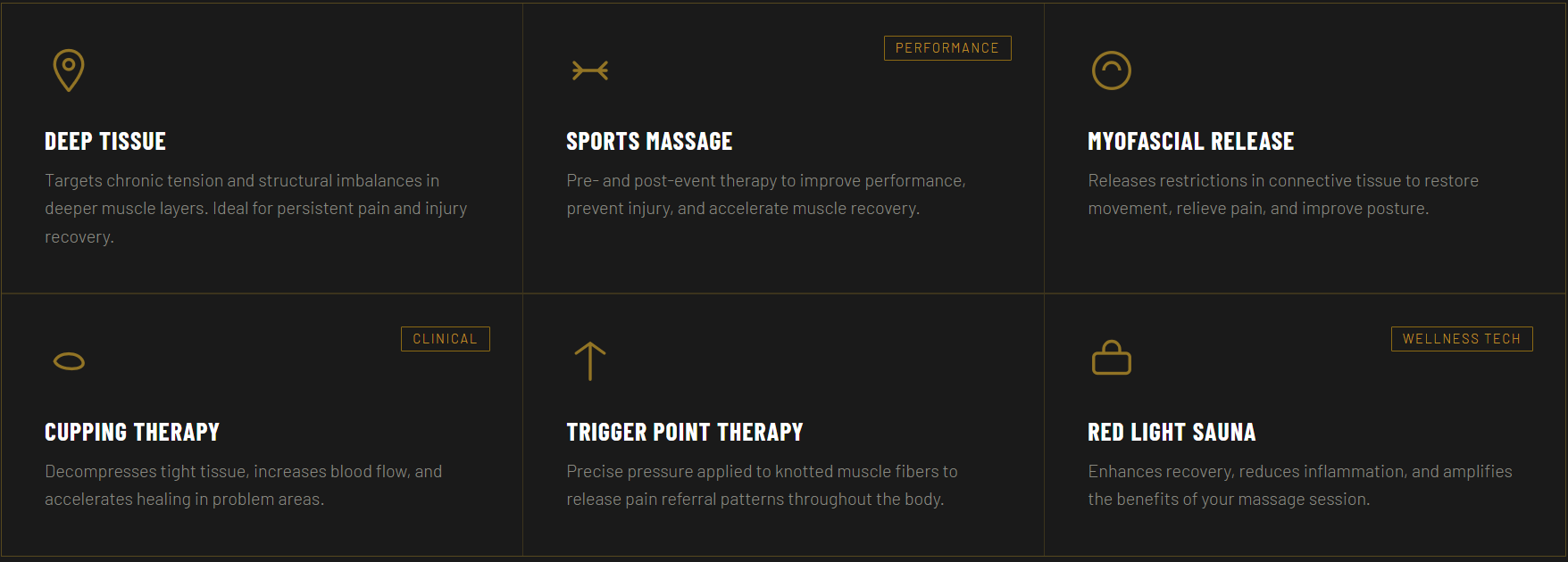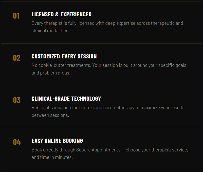 Therapeutic bodywork built for real results — deep tissue, sports recovery, clinical modalities. For people who need to function, not just relax.